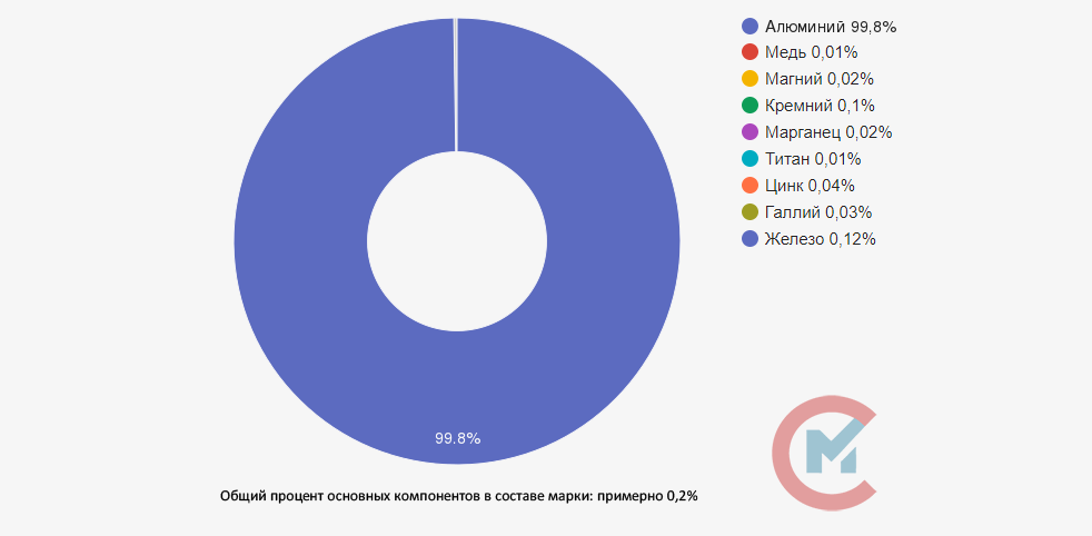 Содержание алюминия в сплаве марки А8: 99,8%. Также в нем содержится 0,01% меди, 0,02% магния, до 0,1% кремния, до 0,02% марганца, до 0,01% титана, до 0,04% цинка, до 0,03% галлия, до 0,12% железа.